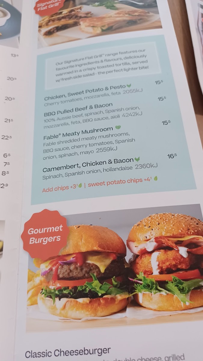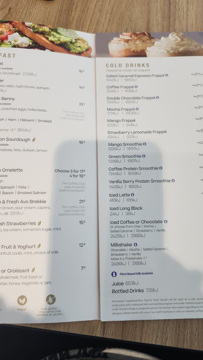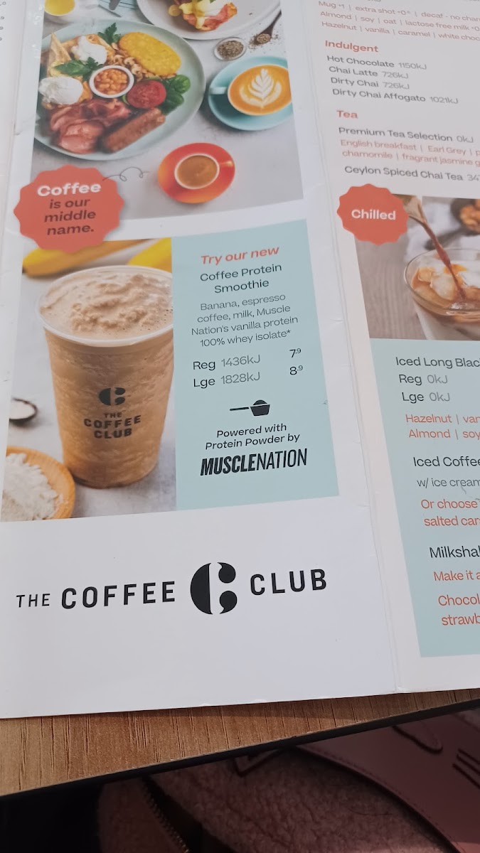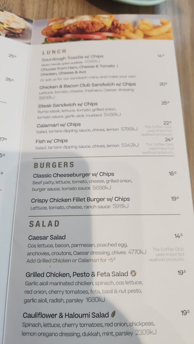 The menu at The Coffee Club in Westfield Carousel offers a variety of satisfying options catering to diverse tastes. For lunch, you can enjoy hearty dishes like the Sourdough Toastle with Chips, Chicken & Bacon Club Sandwich with Chips, or the classic Steak Sandwich with Chips. If you're in the mood for seafood, the Calamari with Chips or Fish with Chips make for excellent choices. The burger selection includes the Classic Cheeseburger with Chips and the Crispy Chicken Fillet Burger with Chips, both satisfying options for those craving something indulgent. For a lighter meal, there are refreshing salads such as the Grilled Chicken, Pesto & Feta Salad, Cauliflower & Haloumi Salad, and the timeless Caesar Salad. When it comes to beverages, the Summer Mocktails like Mojito Crush Frappé and Piña Colada Frappé offer a refreshing twist, while the Cold Drinks range from the Salted Caramel Espresso Frappé to the fruity Mango Frappé. If you’re after something cozy, opt for a Hot Chocolate or the unique Dirty Chai Affogato. For tea lovers, the Premium Tea Selection and Ceylon Spiced Chai Tea provide comforting warmth. Indulge further with sweet treats like Buttermilk Pancakes or a Fruit & Yoghurt option. The wide variety ensures there's something for everyone, whether you're stopping by for a quick bite or settling in for a leisurely meal.